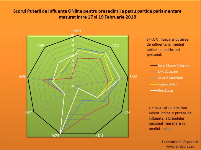 Cei mai multi dintre specialistii in comunicare digitala sunt de acord ca “100 de oameni care vorbesc despre cineva inseamna mai mult decat 1000 de oameni care au auzit de acel cineva”. e-LABORAT: Laboratorul de Reptatie a masurat intre 17 si 19 februarie 2018 cu ajutorul Scorului Puterii de Influenta Online, nivelul de influenta pe care leaderii principalelor partide parlamentare din Romania o exercita in mediul online.